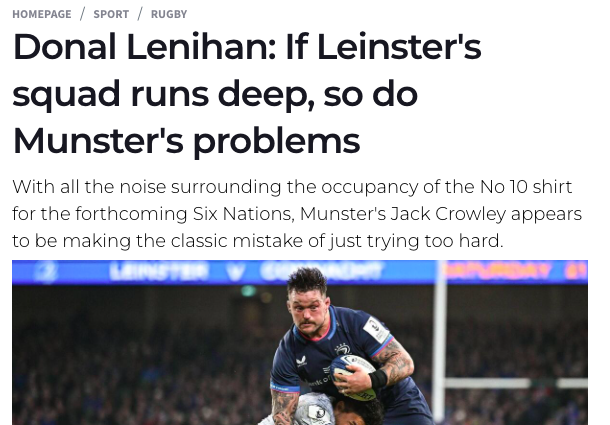 The active part of this sentence is “Munster’s Problems” framed opposite to a Leinster positive, which is sure to draw a tonne of clicks from both Leinster fans (who want to revel in the positive/negative differential) and Munster fans, who want to tongue the ulcer, so to speak.