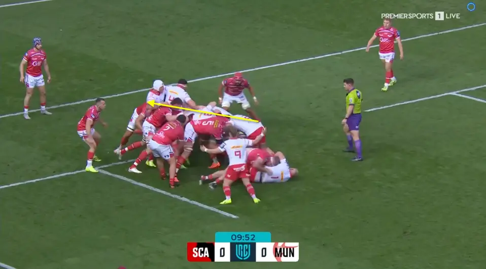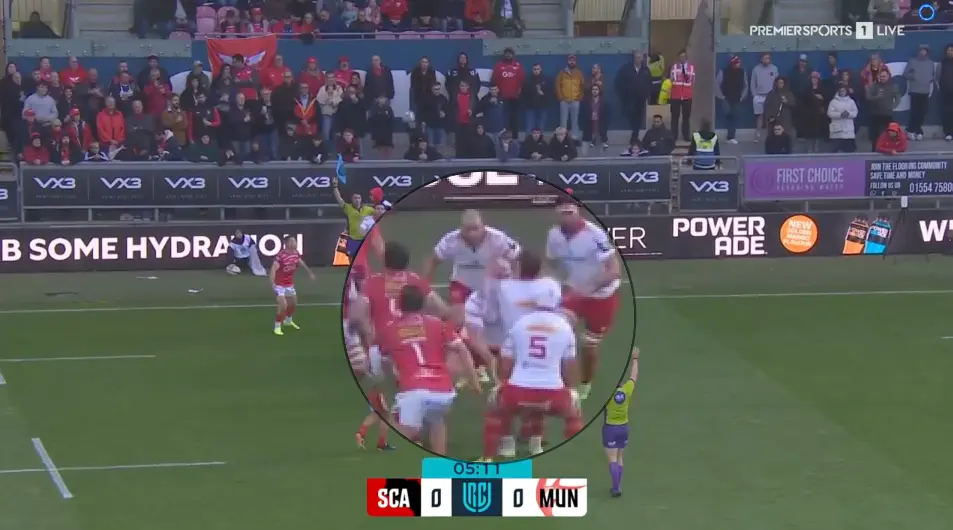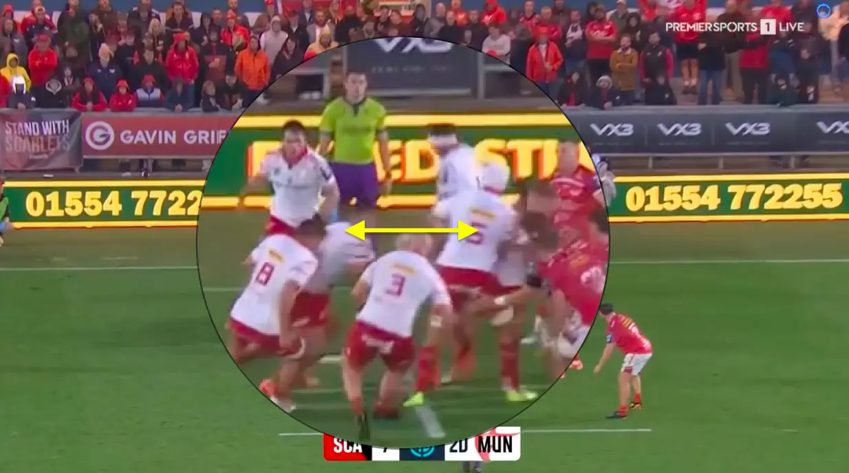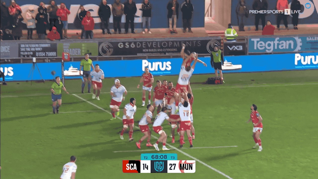 That’s a clean take in a nice, uncluttered window, and, for me, it probably should have been a Munster penalty for the player jumping across into our maul build, but we play out from it.