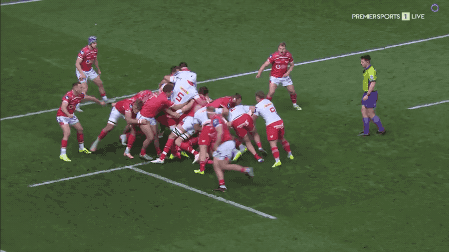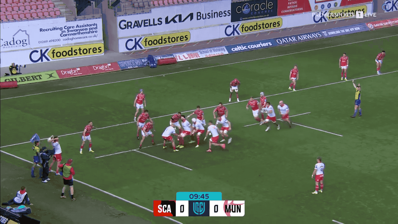 His leg drive on Fineen Wycherley here is really impressive and it chews away at the Scarlets infield defence. Lee Barron breaks a little early for me here — there was a penalty to be soaked out of the Scarlets — but simplicity did the job here. A good lift, a good “sink” where the Wycherley brothers have full control of Ahern in the air, so can time a solid sink into the Scarlets counter-shove on the drop, with a punchy three-man drive unit driving into that space.