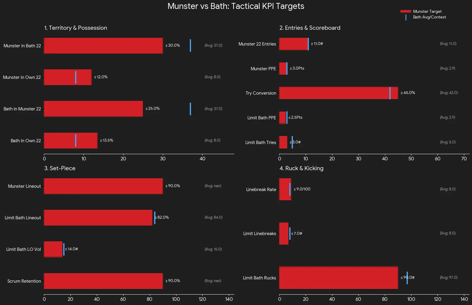 • Munster ≥ 90% retention, plus 2+ penalties/clear wins on Bath ball. This is the biggest ask.