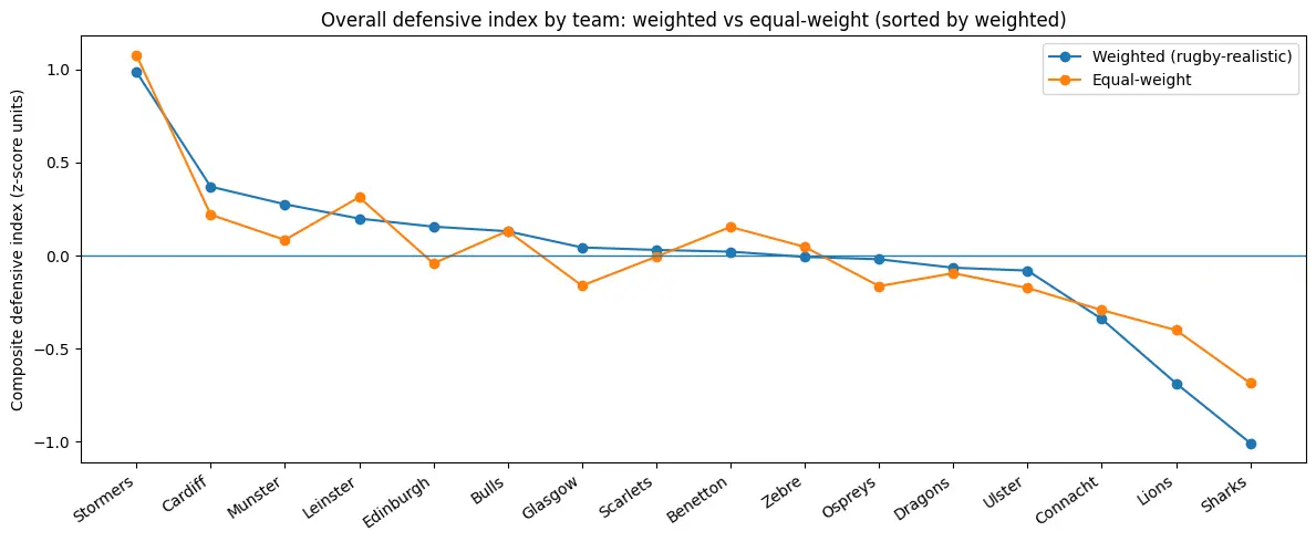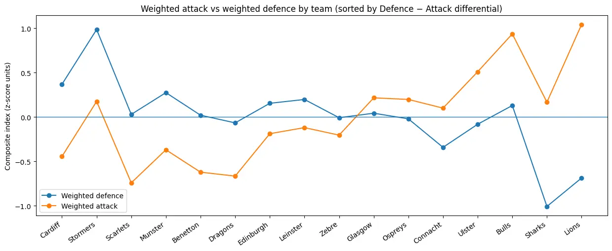 What this differential chart really shows is that we’re a defence-led team at the moment. Our weighted defensive index is above league average (+0.275), but our weighted attacking index sits below average (−0.369). The gap between them — Defence minus Attack = +0.644 — is one of the bigger imbalances in the league. In other words, we’re getting more value from how we stop teams than from how we stress and break them. In a situation where we leak tries through errors or set-piece malfunctions, we don’t have the attacking output to overcome our defensive system coughing up points.