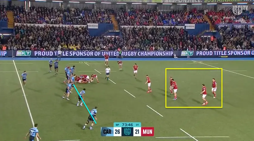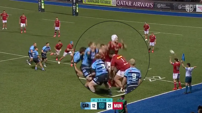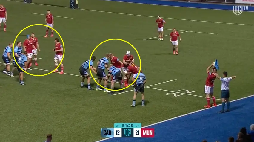 We set up with a 5+1 structure. Straight away, you can see two contest zones – Donnell marking Beirne at the tail, McNally at the front marking Wycherley. The Cardiff tighthead has a partial starting grip on McNally at the front, and his fellow lock Williams has a partial back-lift grip in place while also partially acting as a defensive hinge.