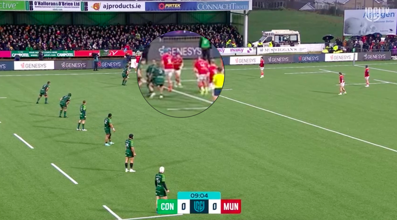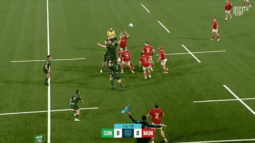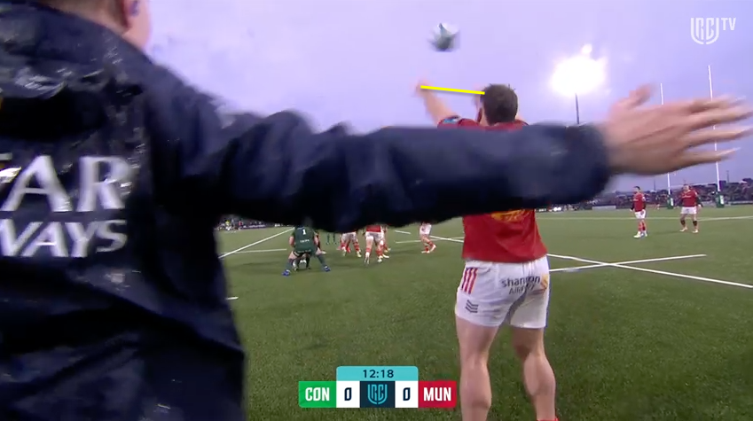 Buckley’s release point is a little too soon – the kind of thing you get from an anxious thrower under pressure – and the speed of the ball isn’t what it could be. Connacht disrupt it but we just about hang onto the ball. This wasn’t counted as a lost lineout but it absolutely should. You can see the issues are already building up inside the first 10 minutes.