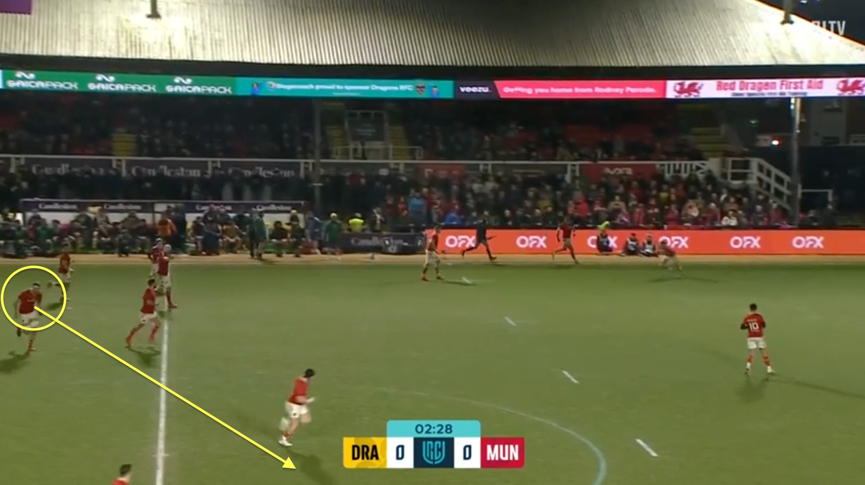 Dragons won a penalty in their half but missed touch – happens a lot these days – and that opened up a long transition for Ben O’Connor, who ran it back straight and hard to the halfway line.