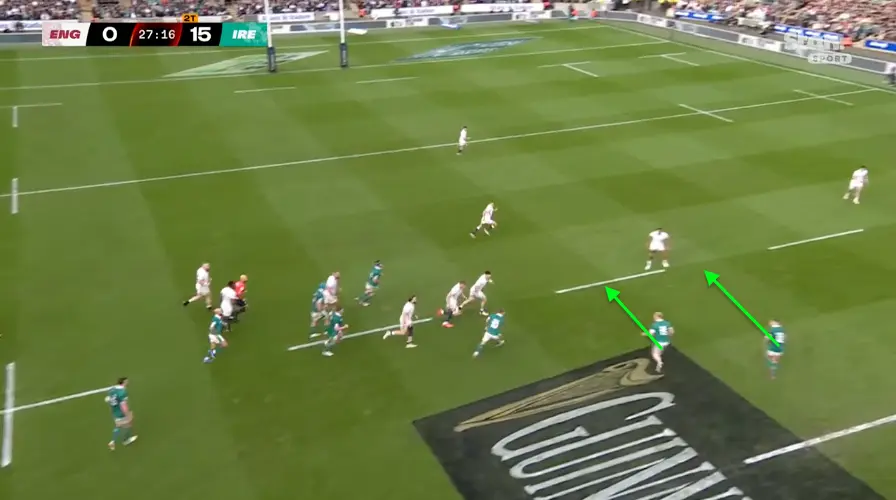 From there, Ireland were playing into a skittering English defence who struggled to get back into position. This was the key bit for me — Ringrose and Crowley tearing up that English edge with a nice Sexton loop. McCarthy made a big carry off the pick and go into space, England gave away a penalty, and Gibson Park made them pay.