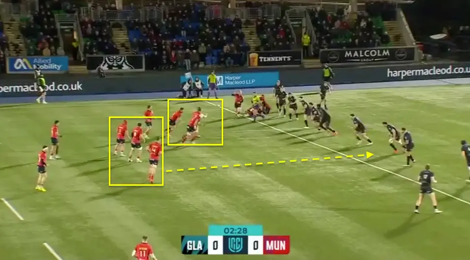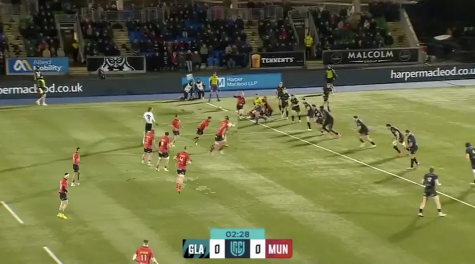 Glasgow have a lineout and move to the middle of the field. We know from watching Glasgow that they love playing to width here, but we make a key mistake early.