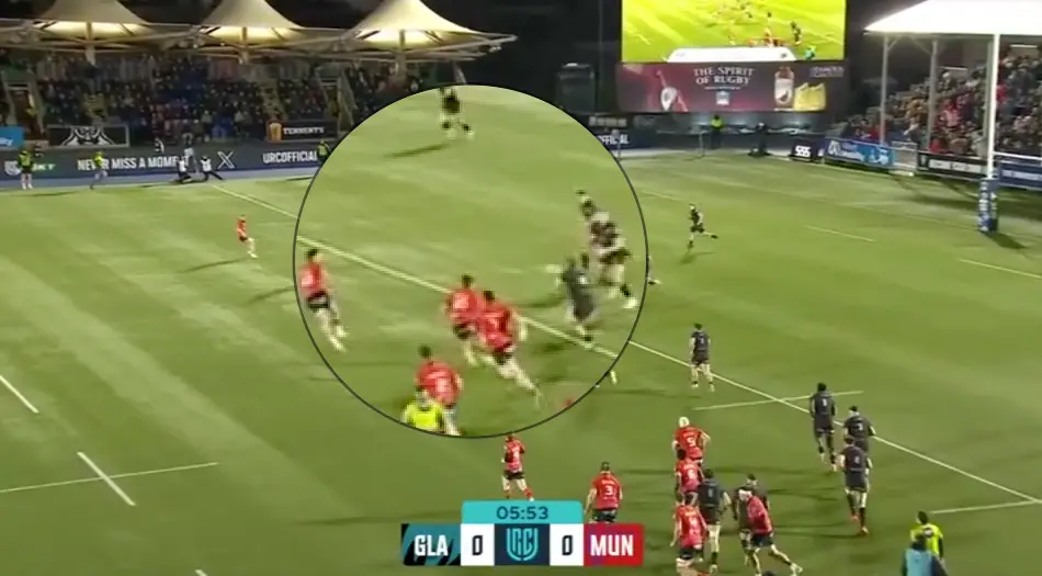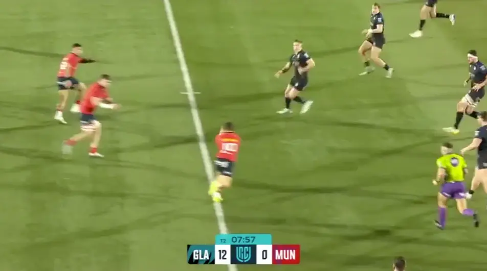 That pulls in Daly, which, in turn, puts Kilgallen on an island and Glasgow are away up the far edge on a play that should really have been stopped on their 22. Abrahams tries to scramble back, but he can’t win the collision going backwards, and Glasgow pick up a 22 entry that they convert on the far edge to go 7-0 up.