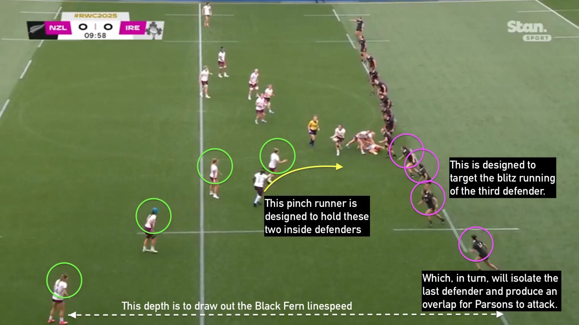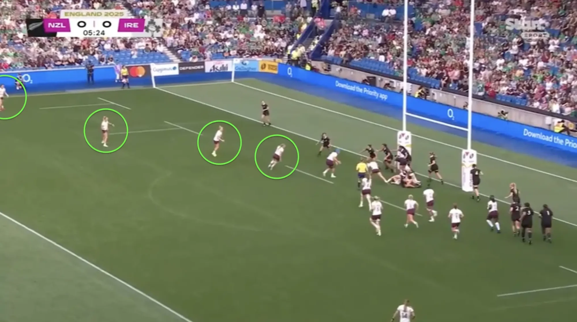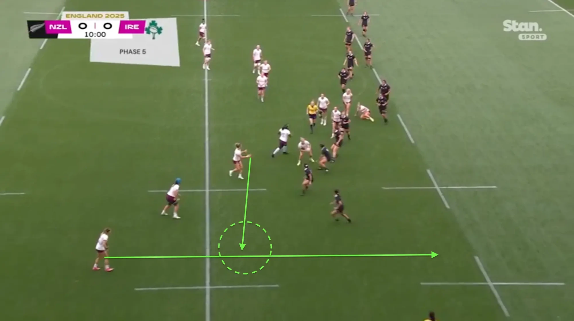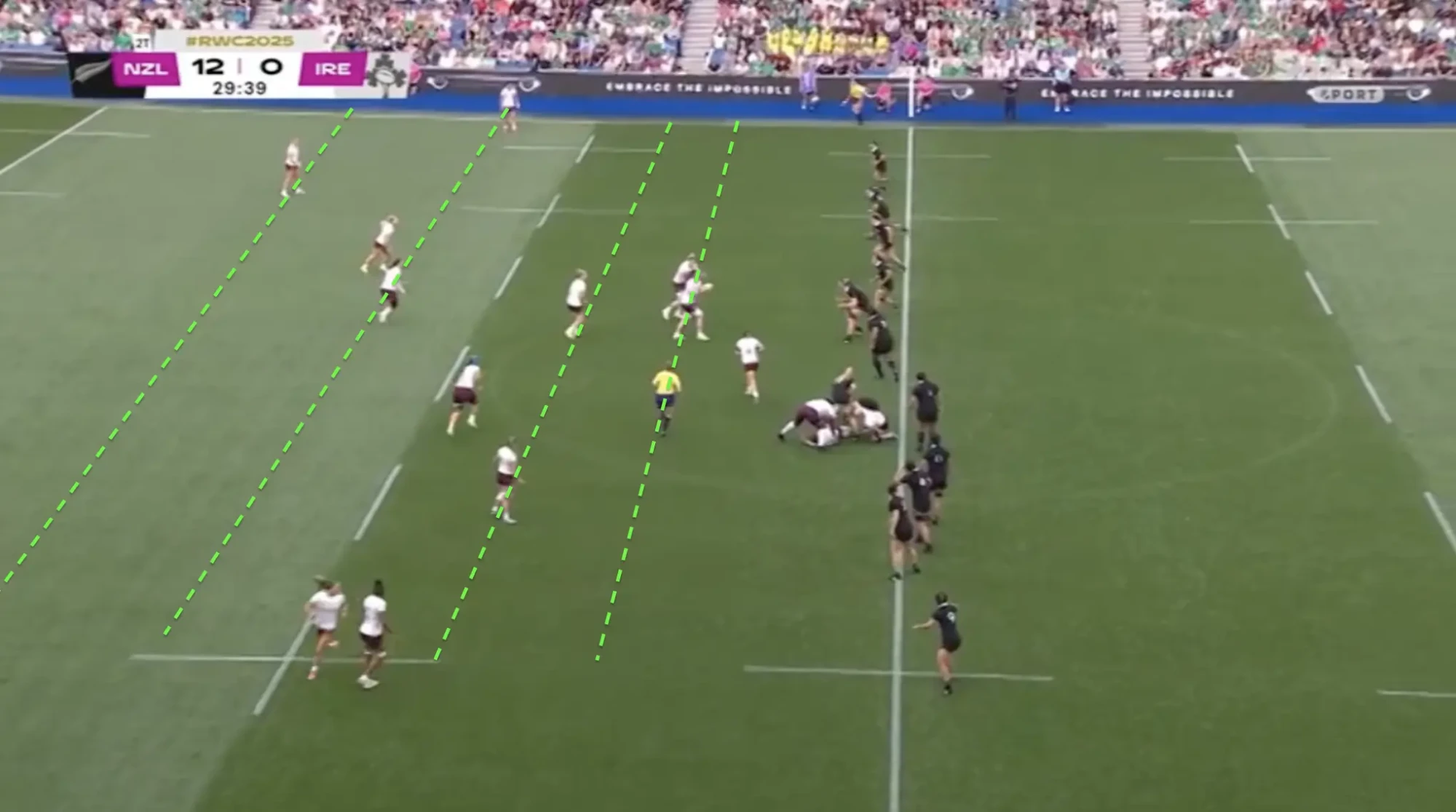 Ireland so rarely used the inside pinch option — because it was a fundamentally bad pass option with guaranteed contact and no on-site ruck support — that the Black Ferns could easily shoot up on O’Brien’s outside regardless of what might be lurking outside.