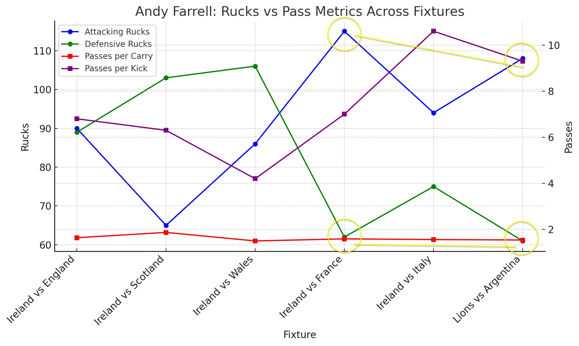 • In Ireland’s other wins – even the ones where they played badly – either defensive rucks stayed high (75+ in the Italy game), attacking rucks were more moderate (<100), or passes-per-kick stayed lower (<7).