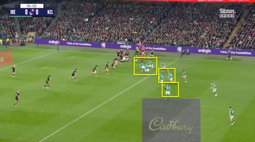 Watch a lot of Ireland’s strike plays and you’ll see the offload option on phase one or two. This one is a good example of one that maybe should have gone, especially with Crowley running the hard offload line outside Kelleher.