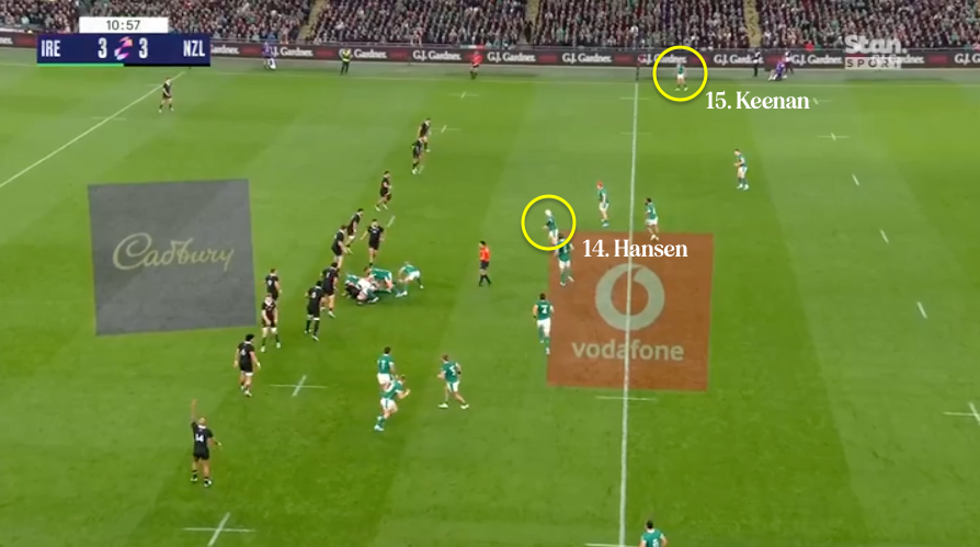 Because here’s the real issue with this game; New Zealand completely denied us counter-transition possession until the last 20 minutes, and even then they shut down the transition window so quickly it’s like they never made the kicking error in the first place. MacKenzie’s contestable here is OK but Hansen’s take is superb. If Ireland could get shape off this – we’re right in business.