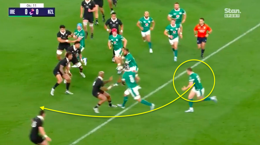This is a classic example of an Irish transition structure in the last year or so. Keep in mind that Crowley – guarding the backfield on this play – was involved in the ruck the clip starts in.