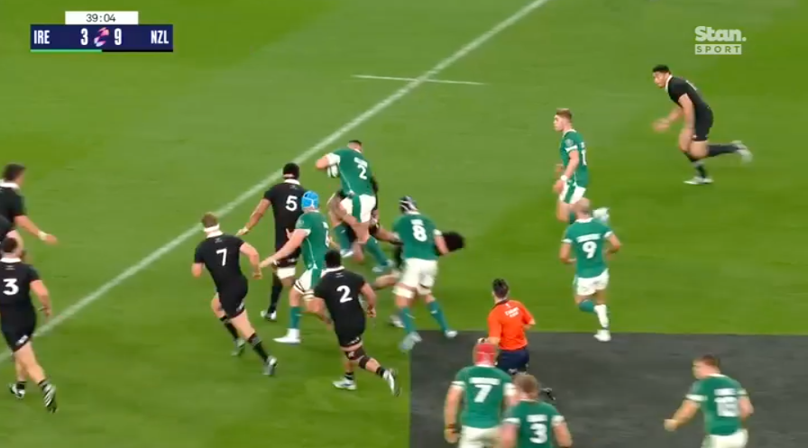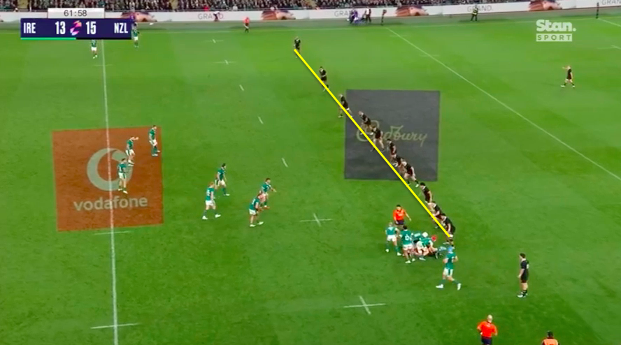 But now that escorting a catcher = a full penalty, box kicking has become ridiculously overpowered. The All Blacks box-kicked eight times in this game for an average of just 25.5m per kick which meant that not only did Ireland have to stress the taking of every single kick but the short distance meant that the All Blacks defence was always set when the ball came back. And, because the All Blacks essentially surrendered the ruck to Ireland in all but the most obvious poach attempts, it meant they had 13/14 men on their feet right in the line of the Irish attack, which has done so well getting set on counter-transition sets while the opposition got into defensive positions.