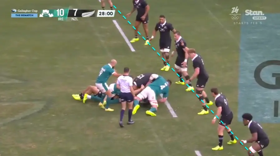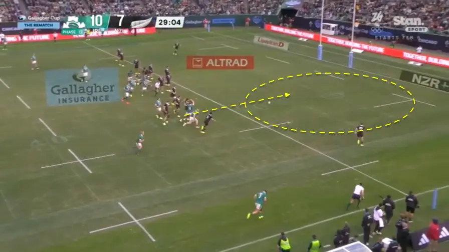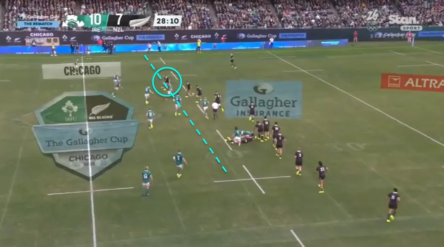 When Gibson Park sees that picture, he tends to look for an edge-finder pass. The All Blacks edge has to step up onto the line of that pass — not blitz high into the second layer, but enough to make a screen or bridge pass a big risk — and force Ireland back inside.