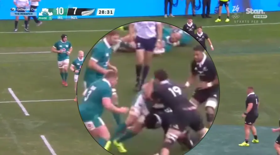 New Zealand had a very specific defensive approach here, which many sides have used against this Leinster/Ireland carrying rotation with a lot of success. Essentially, make two-man stops, with the second man adding extras to a counter-ruck if possible, while the rest of the defence pack the pillars to stop Gibson Park — our primary linebreak generator between 2021-2023 — from sniping into the exposed fringes.