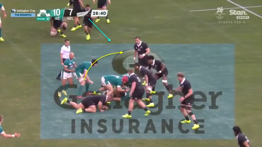 We lose three forwards to this ruck, and it’s slow anyway because Gibson Park is buried at the previous ruck. Ideally, Ryan would stay on his feet here to give Henderson and Furlong a chance to drive through on him and drag more All Blacks into the collision, but he’s stopped dead on contact.