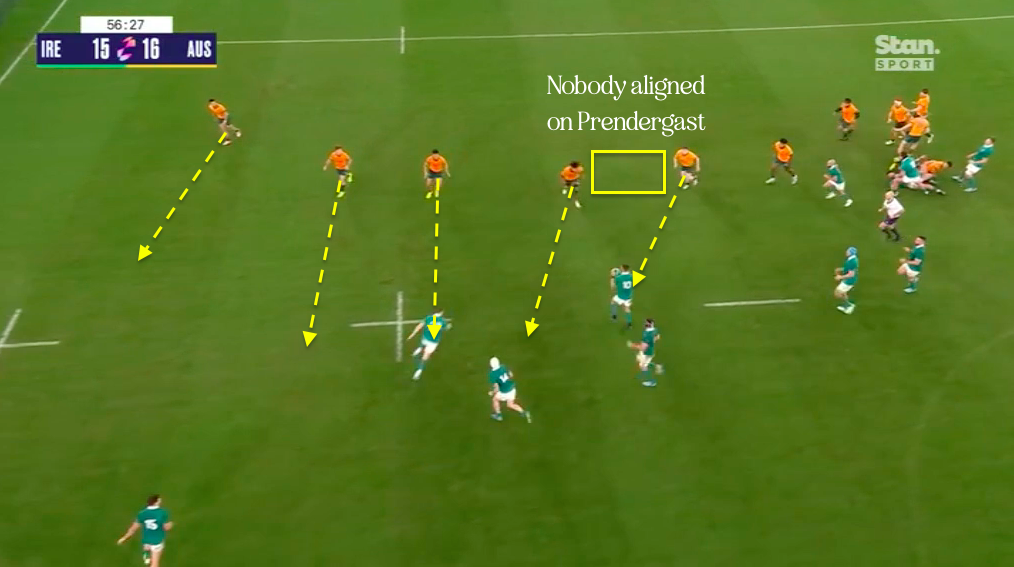 So Australia did from the start what Argentina started to do after 10 minutes of Prendergast two weeks ago; they shifted all their defenders out by one slot and left an inside defender to guard Prendergast. That meant that Australia could just file out and go man for man on every Irish runner. With no compressions to work with, Ireland got stuffed and stymied.