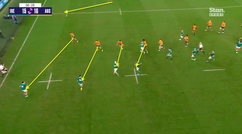 Almost all of Ireland’s attacking work in this game was, like this, played in front of the Wallabies and never outside them because they almost always followed the key principles. This is another example of what looks like a well executed Randwick/Sexton Loop play but that fails fundamentally because there is never any moment when the player that the loop targets is caught in two minds.