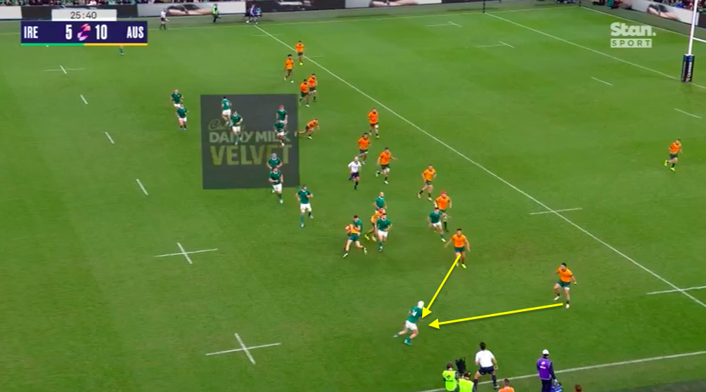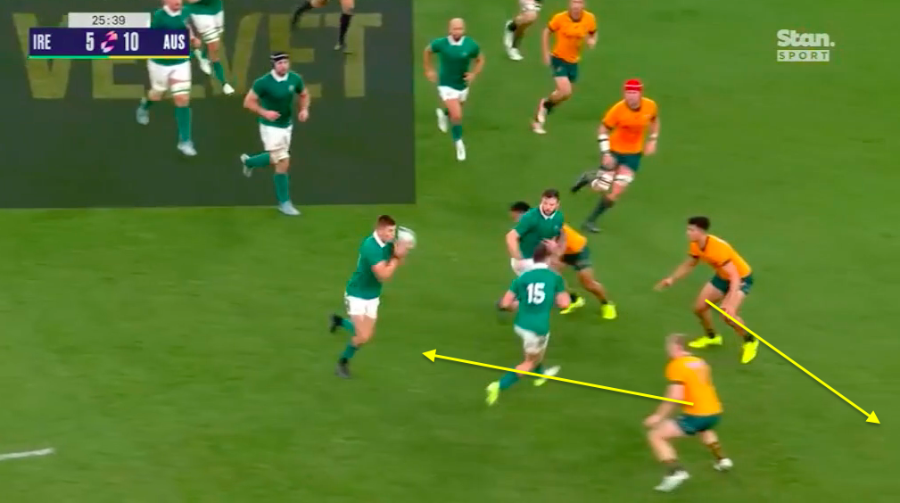 Why is it that Australia consistently left space like this behind Ireland’s attacking rucks? We don’t normally see that much space behind a ruck, right?