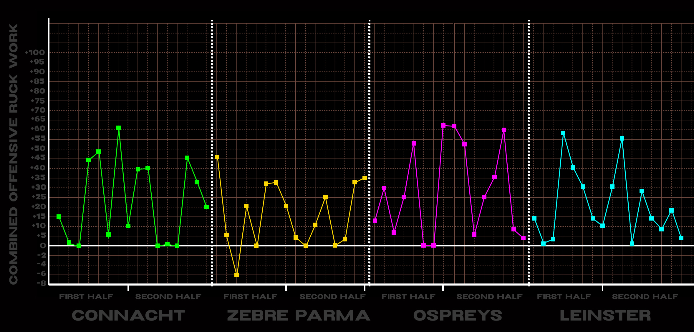 Against Zebre, we scored an average of 3.6 ORW points per ruck. Against Connacht, the average per ruck was 4.64.