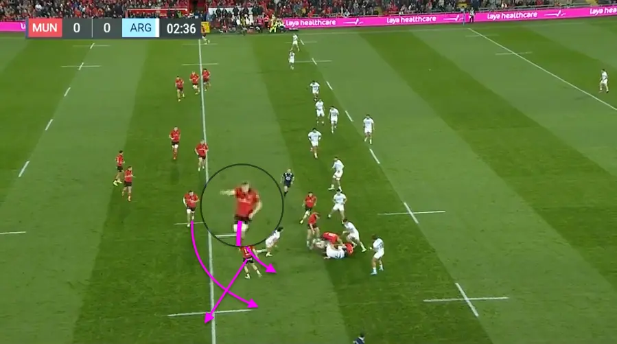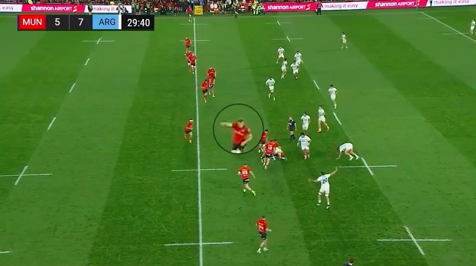 But Munster resisted. Every tight carry was met with a tight defensive shot. This sequence is a really good example. Argentina had penalty access to the 22 — a good few of those early on — and once they broke off the maul, it was all about whether or not Munster could keep up that two-man tackle pressure.