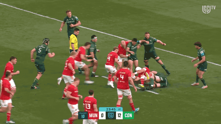Munster took the lead again in the second half but fell behind again on a badly defended goal line dropout defensive set where we overstacked on a side of the ruck with only one Connacht attacker, shot out on Ioane needlessly and then saw Connacht slip into the backfield far too easily.