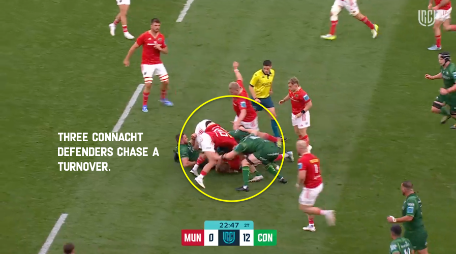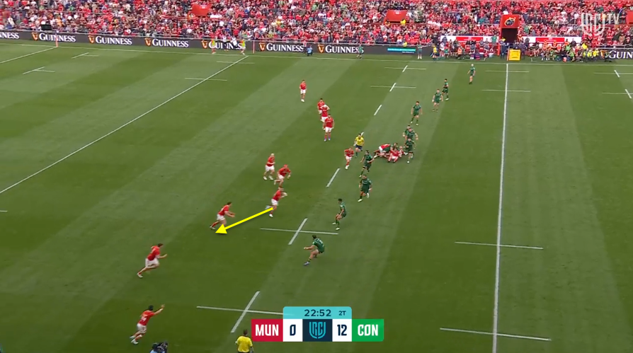 Look at how Connacht over-chased the ruck – they smelled a big moment on turnover – but lost three defenders in doing so. You can already see the space opening up behind the ruck.