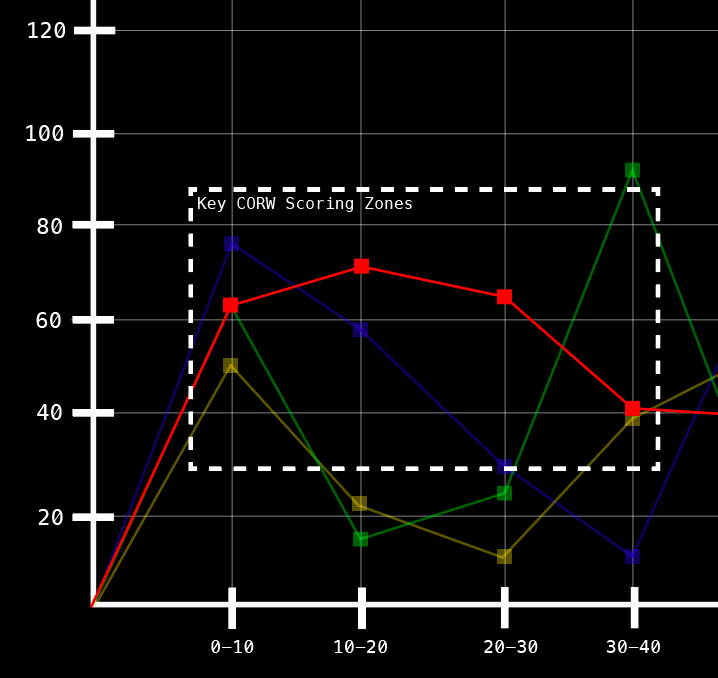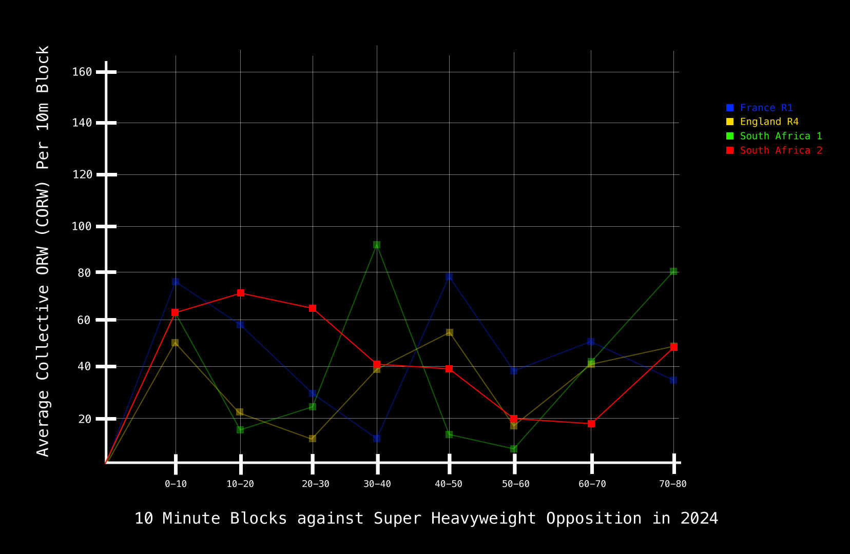Those three 10-minute blocks – the first half an hour – essentially featured massive ORW scoring on 3.5 passes per kick. What does this mean? Essentially, it means Ireland were unbelievably efficient relative to the same period last week. Ireland almost always start well when it comes to Collective ORW scoring but that second ten-minute block drop-off has happened against England, France and in the first test against the Boks. This time, Ireland improved on that first block of scoring and only tailed off slightly in the third block.