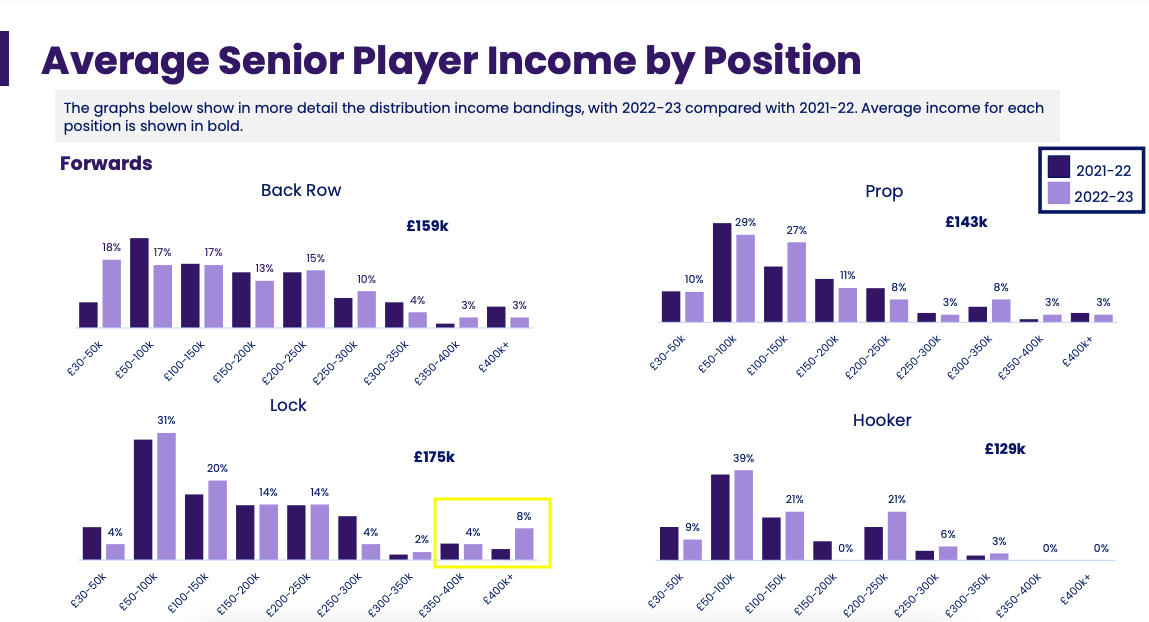 Looking at the payments per position, locks have the highest percentage (12%) of forwards earning more than £350k per year, with three or more lock profile players featuring in matchday squads.