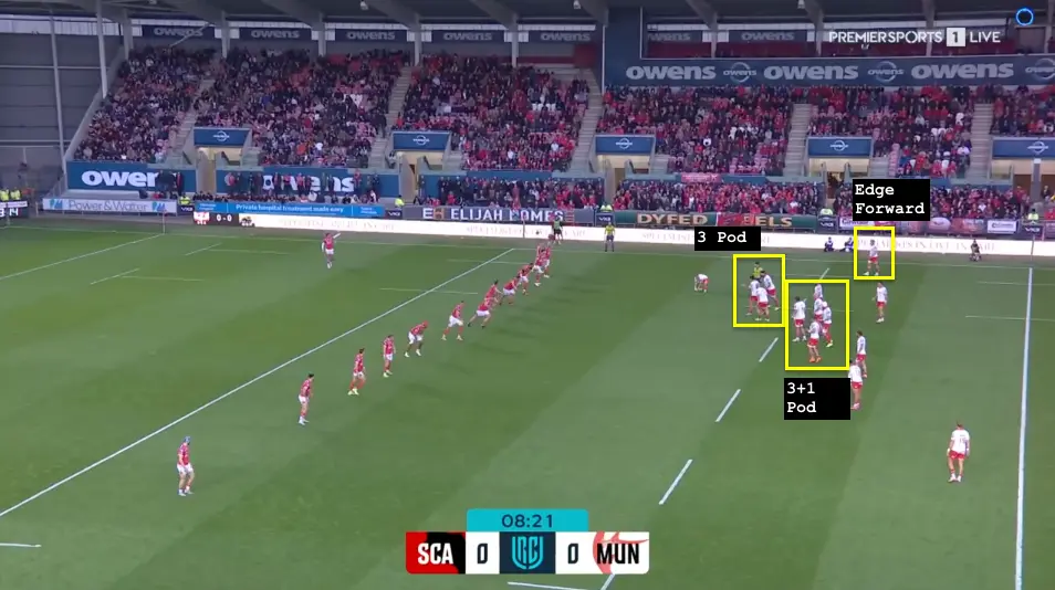 This is a small, but important, change to the 1-3-3-1 shape we used last season. That middle block can look like a four-man pod — and it can operate like that if needs be — but it’s mainly there to smuggle the last forward on the edge onto the next phase as a tight carry option, a cleanout, or a blocker if we want to go to the backline. The edge forward here shows up on the short side of the ruck, rather than holding long width.