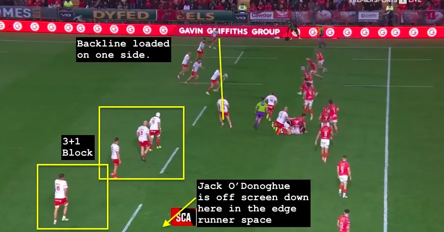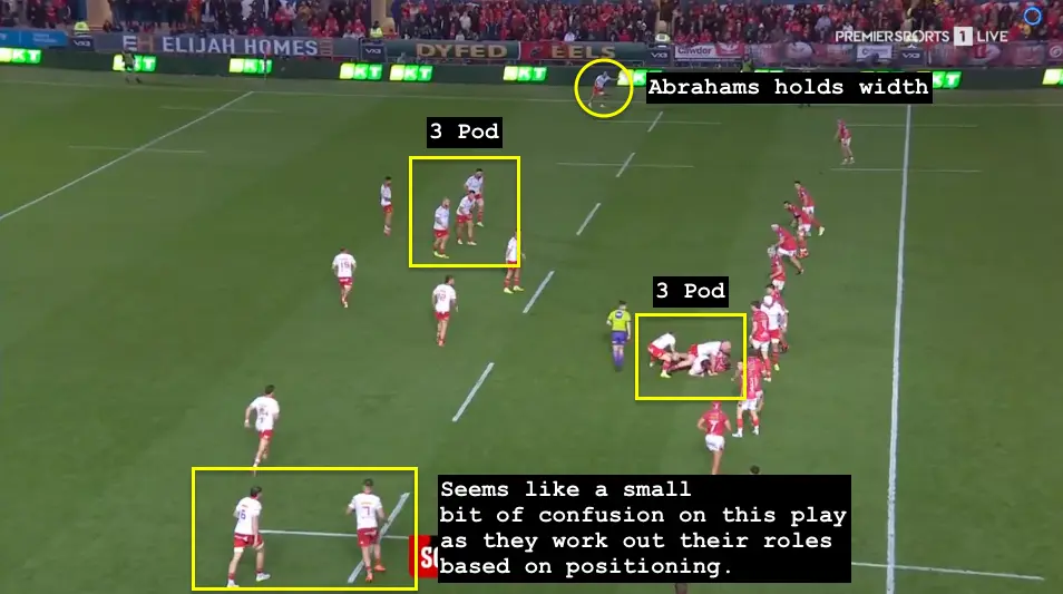 Kendellen works his way to the middle 3+1, Gleeson finds the +1 spot, and Jack O’Donoghue holds the opposite wing to Abrahams, all while the backline loads across to fill the asymmetrical gap around the forwards.