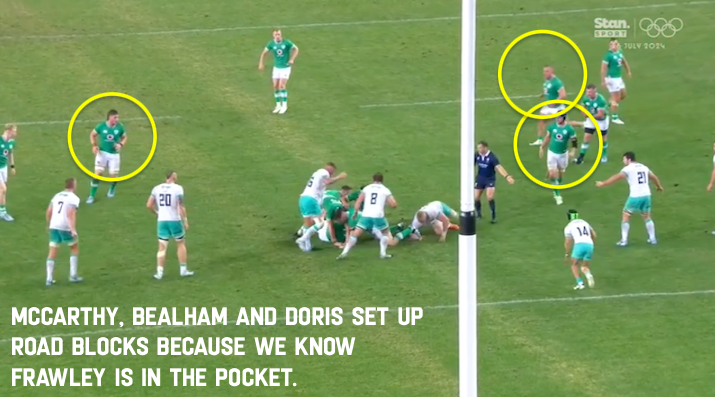 That’s a huge stop by O’Mahony and Herring to dislodge the ball and force a scrum. From here, look, we weren’t going to be winning any scrum penalty so Frawley called a move he’d have run a thousand times at Leinster in training. Loop off the screen ball at #12, perfectly executed by McCloskey, scorch around the compression created by Henshaw and then stab the ball down the line with the right boot and hope to get the ball off the field as close as you can to the 22. Maybe get a 50/22 but at worst, get a lineout platform that Baird or O’Mahony could attack.