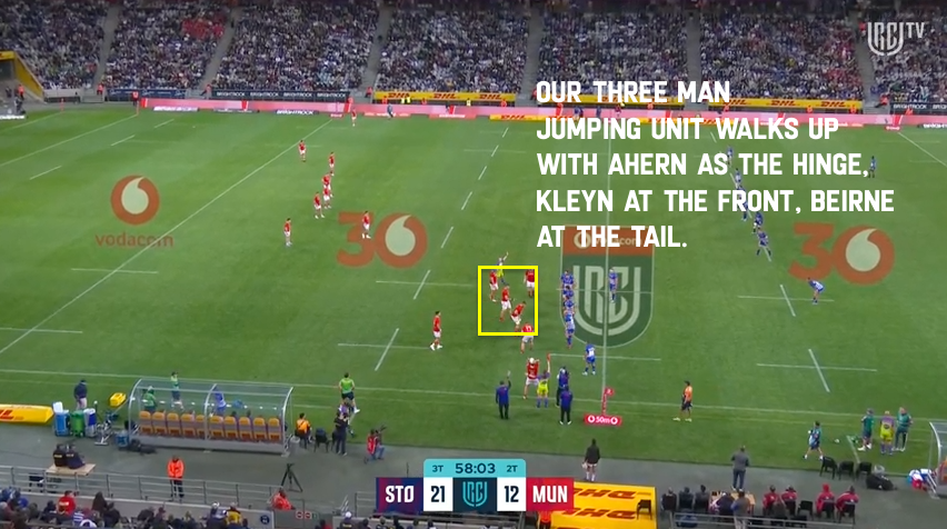 The deception here is that Ahern starts as an “obvious” target in the middle who can also lift Kleyn at the front so, in theory, Stormers have to cover all possible options with their own three jumping options. The whole advantage of a five-man lineout is that you have a dominant position in the “shell-game”. You know where you’re throwing, the opposition doesn’t, and they don’t have enough numbers to put two pods in the air.