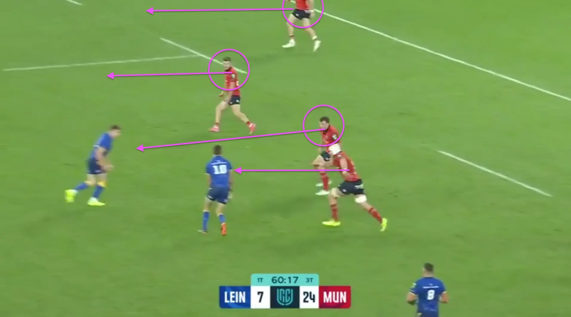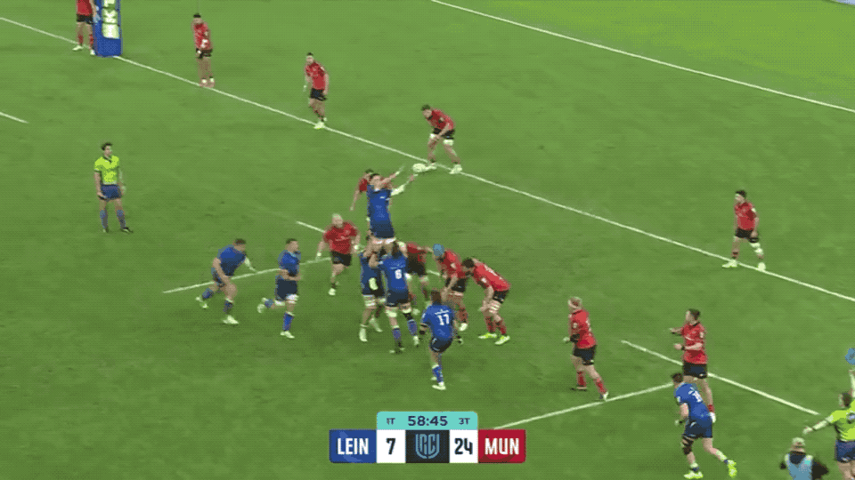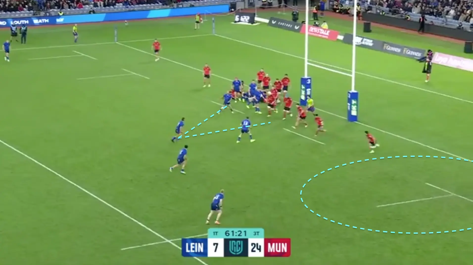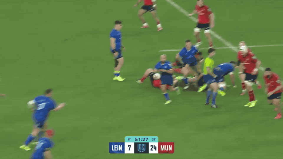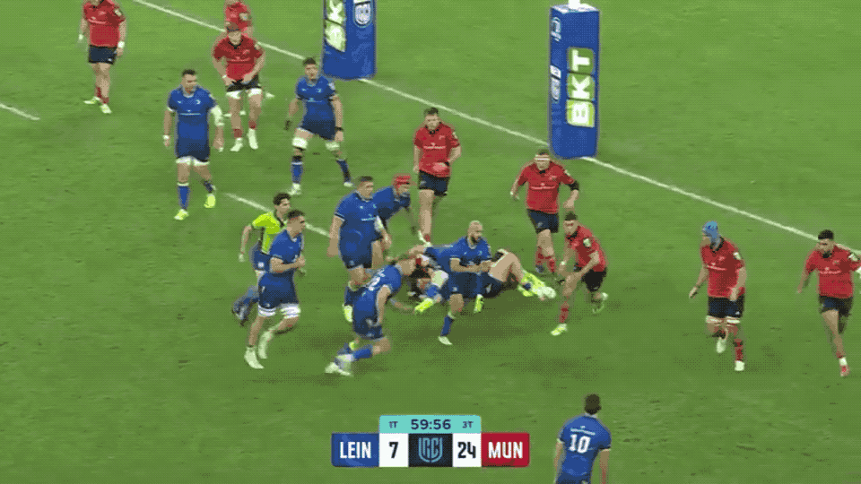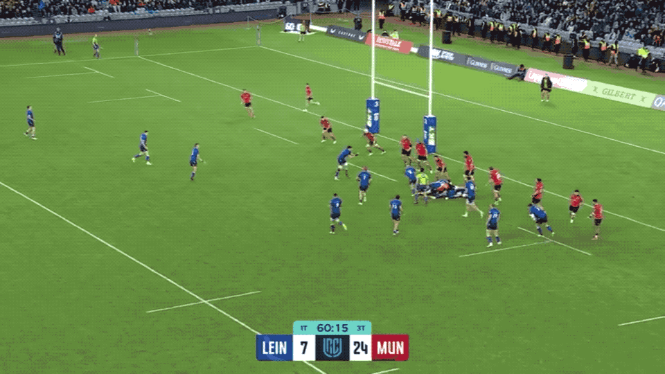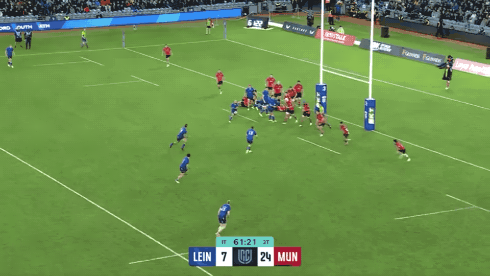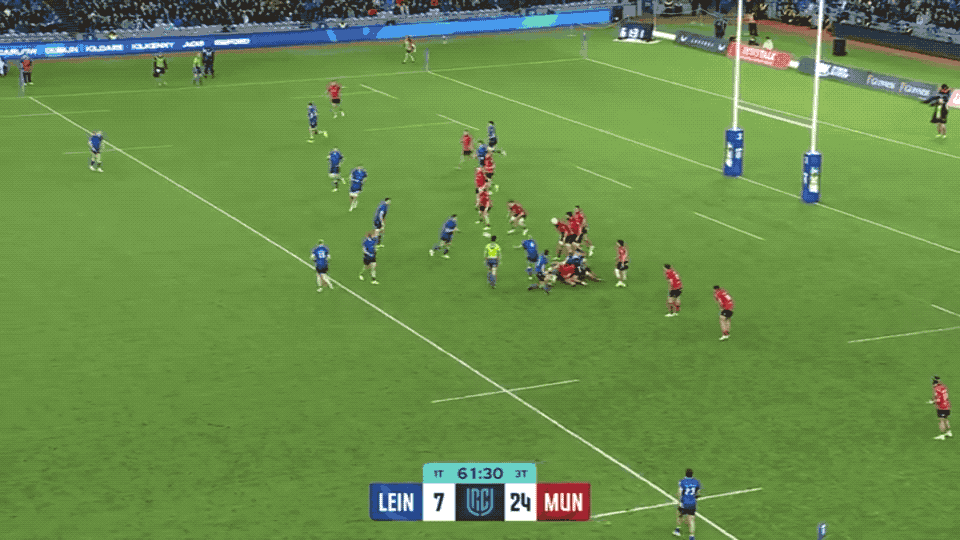 Leinster got the ball back and tried to push the other edge, sensing the space was going to develop there, but Munster were able for that too.