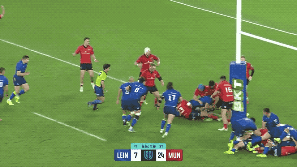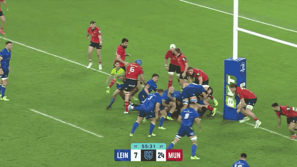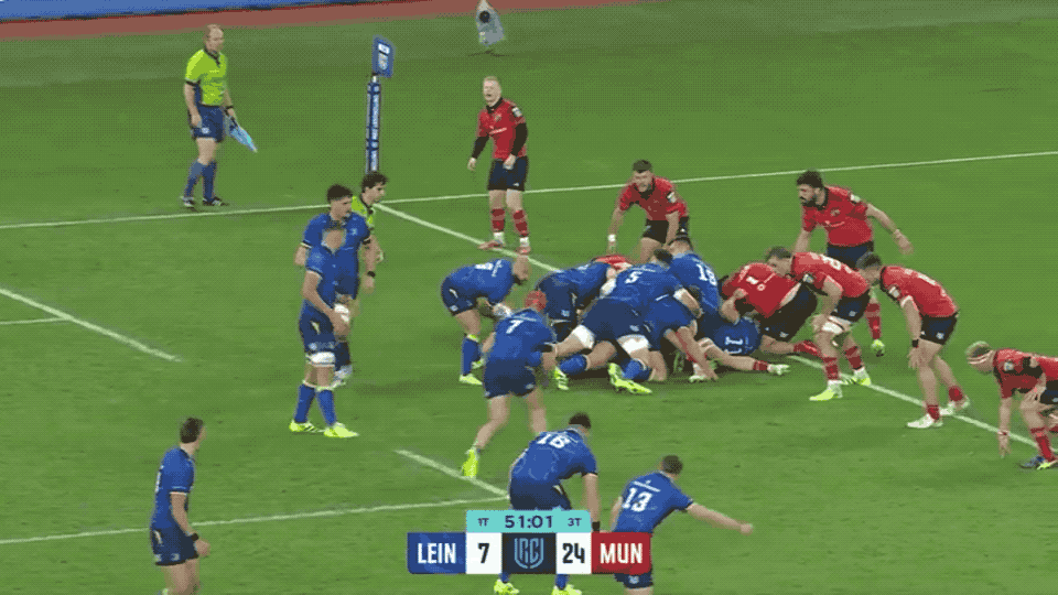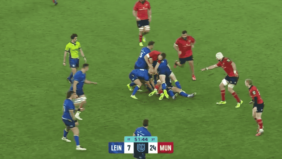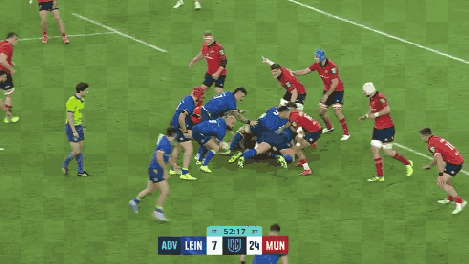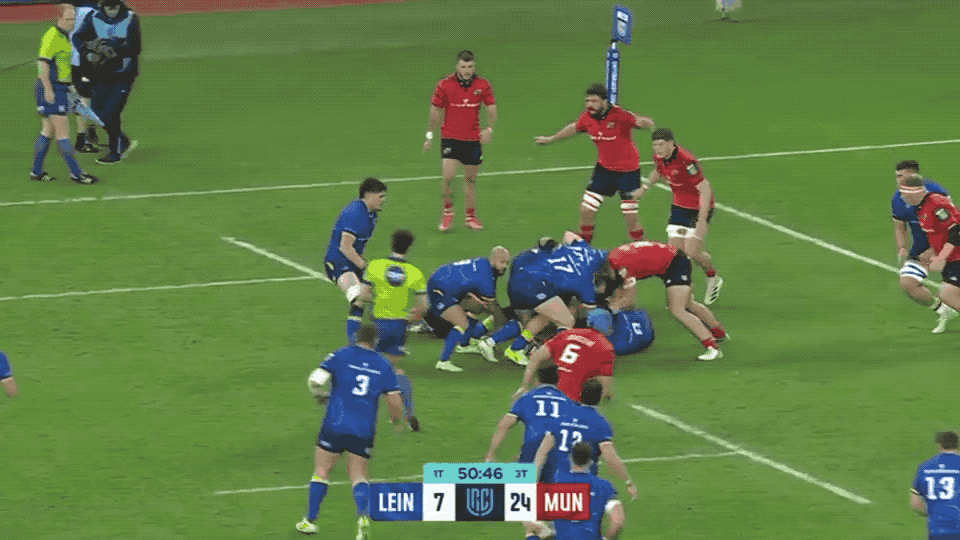 Gibson Park is knocked to his ass, and that buys more time for Munster to get players into the line. Knowing what we do about Leinster here, what’s the next play?