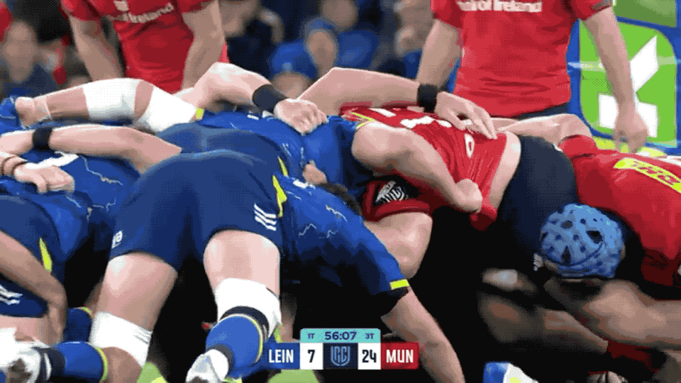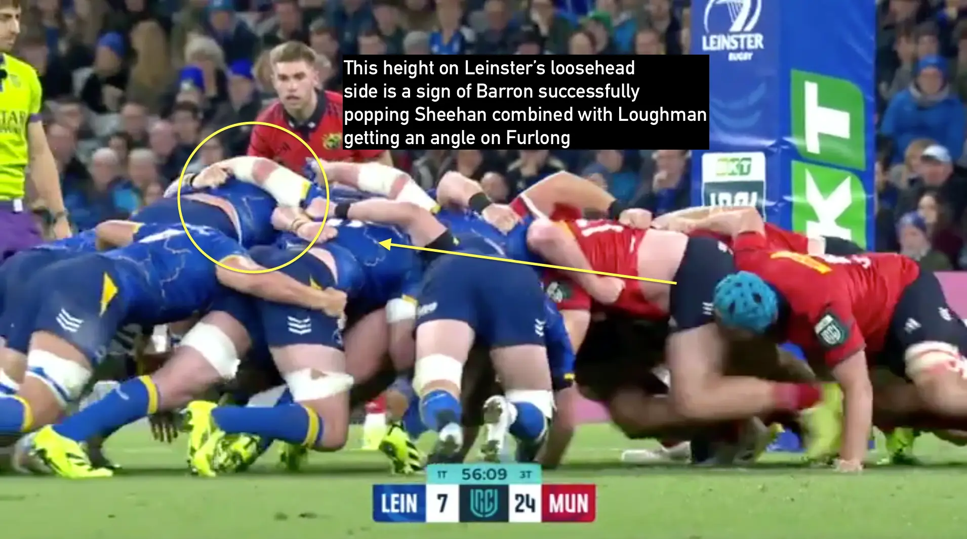 This was Loughman’s second scrum since coming on. On the previous scrum, that ended in a Leinster penalty on our tighthead side, Loughman got a good angled drive on Furlong. This time, without the need for Barron to strike, we could really go after Furlong.