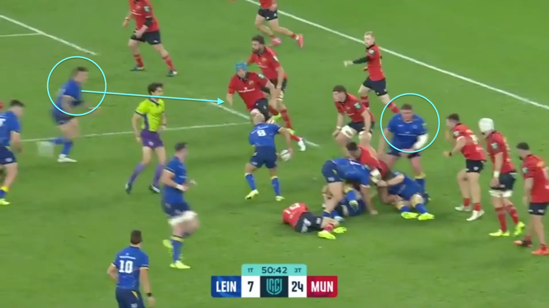 It forces Leinster infield and across for a first stop, helped again by Wycherley pressurising the Leinster infield side into a drop. Beirne comes loose from his initial push and floats around the back.