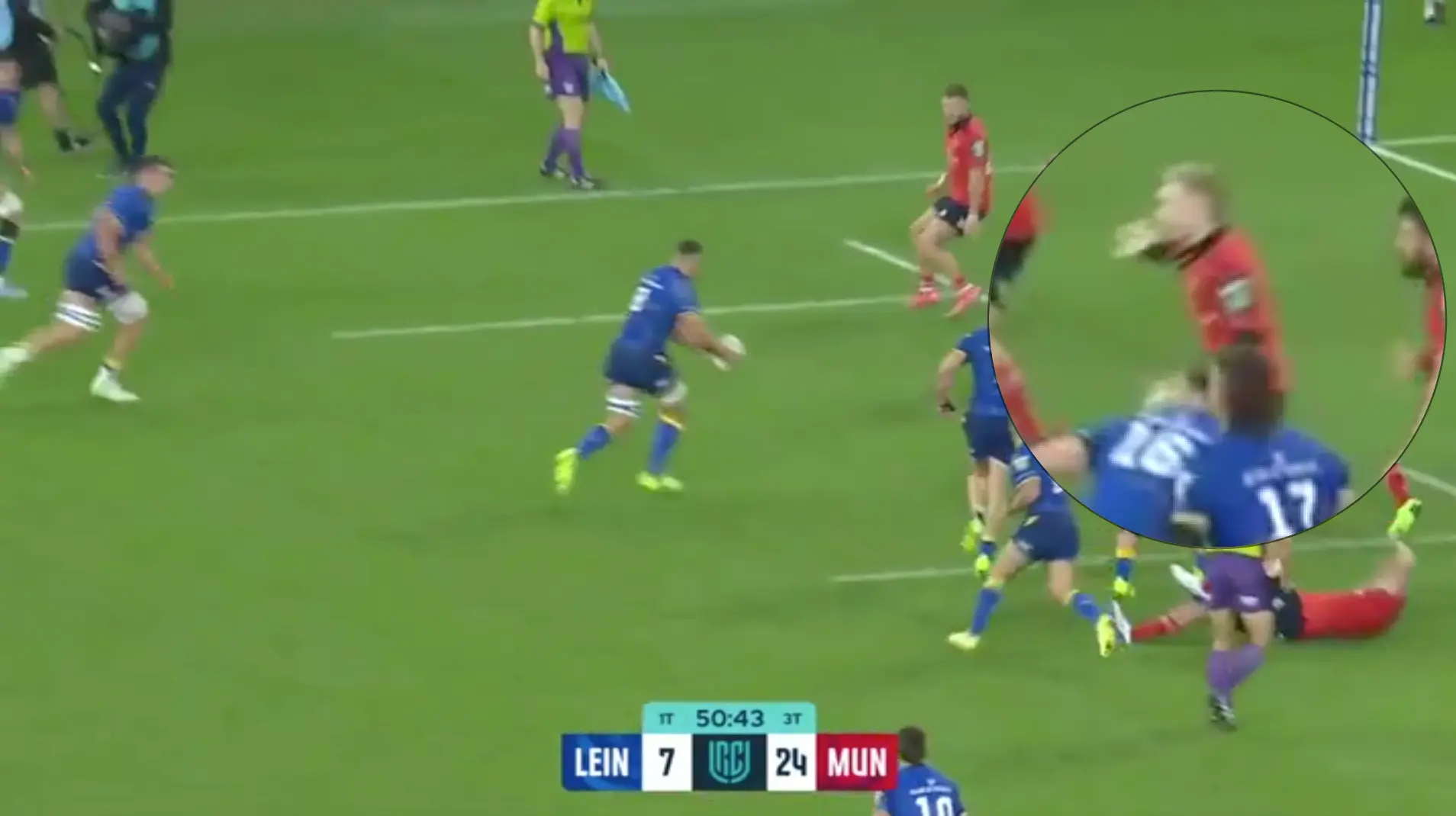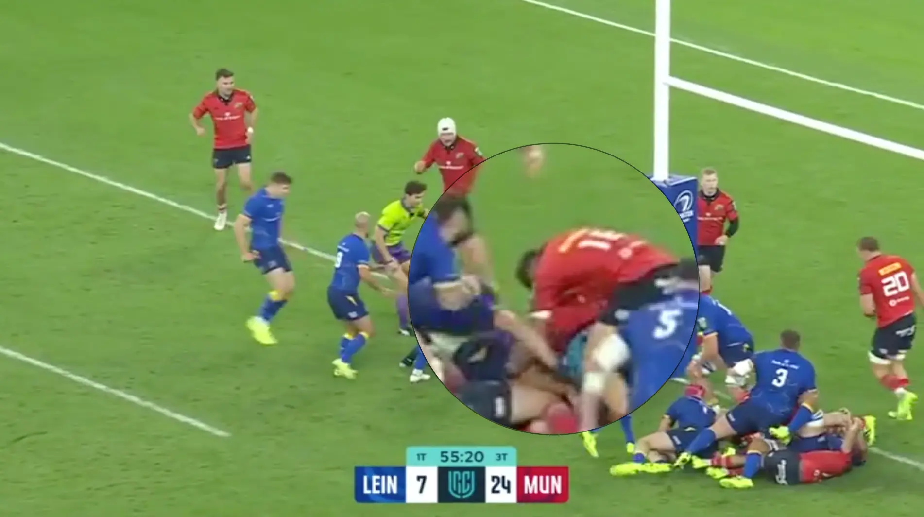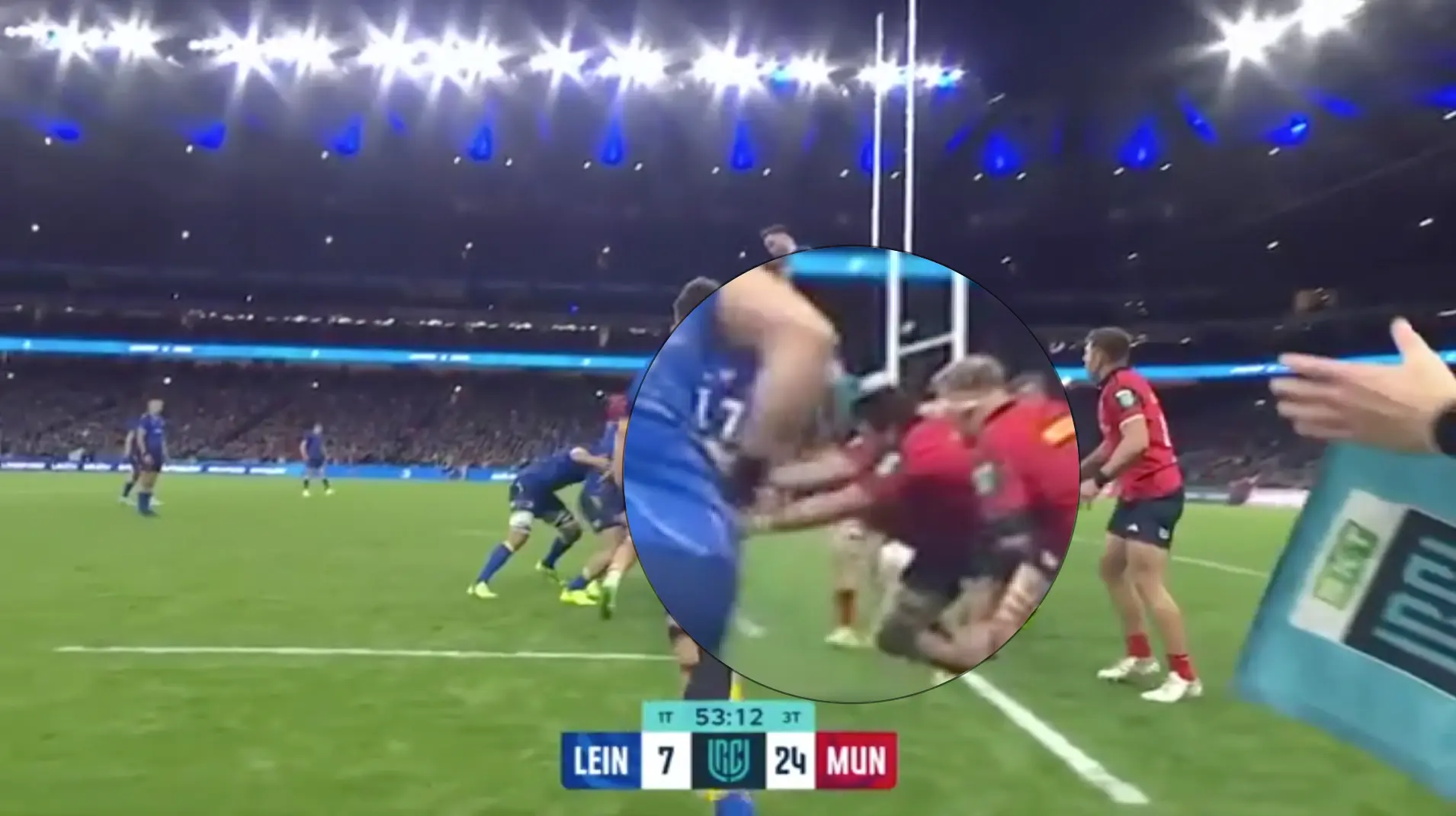 Coombes does a good job of bracing, but Leinster trap him in enough to sell the penalty on a sequence that was going nowhere — it absolutely was a penalty though.