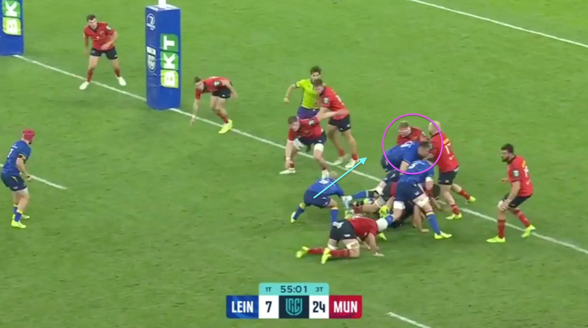 Porter holds Ryan, Leinster’s back five — lead by Sheehan and triggered by Furlong shooting in on the Munster hooker — use that momentum to walk around Porter for huge forward movement, and that’s exactly what they were doing here. They did it really well in the first half, but the addition of Sheehan to the mix opened a window for Loughman to use Furlong’s angle against him.