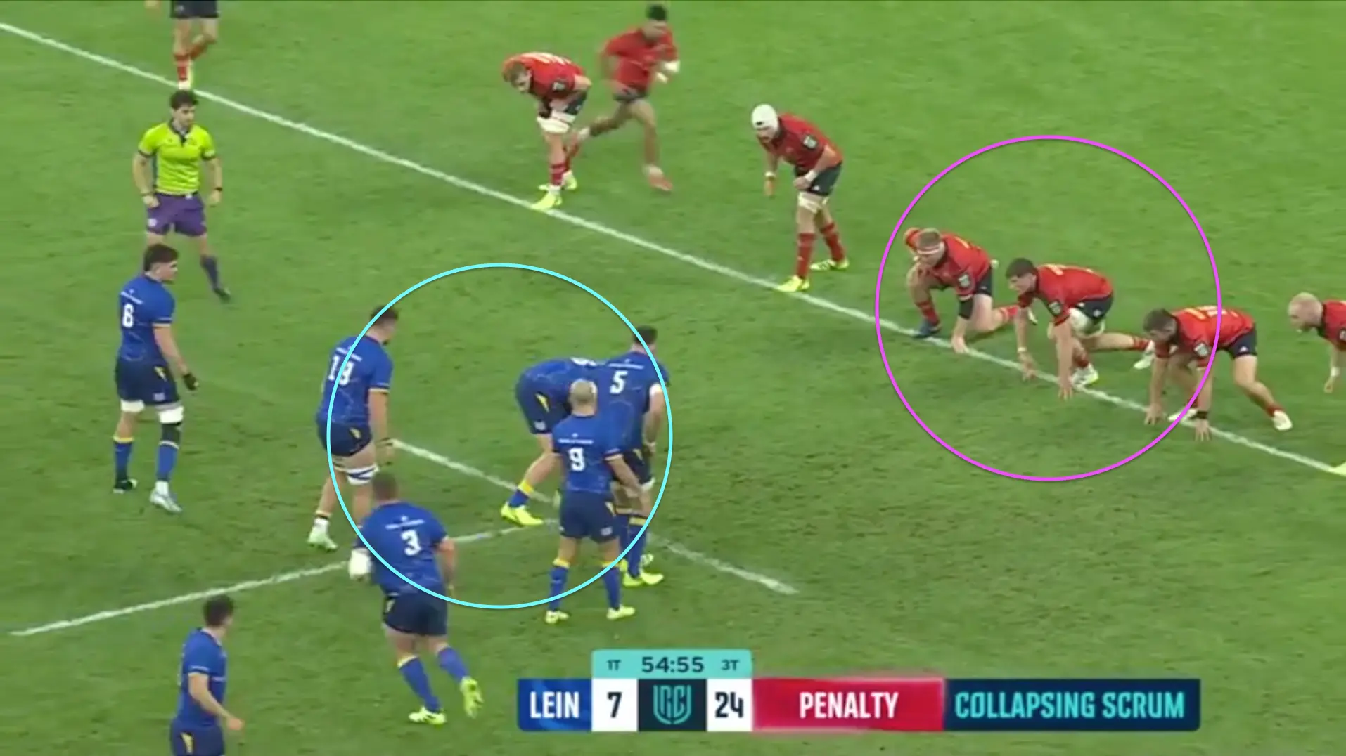 Kleyn reset after stuffing the touchline side and beat up Leinster’s second shove in the same manner — pushing them infield.