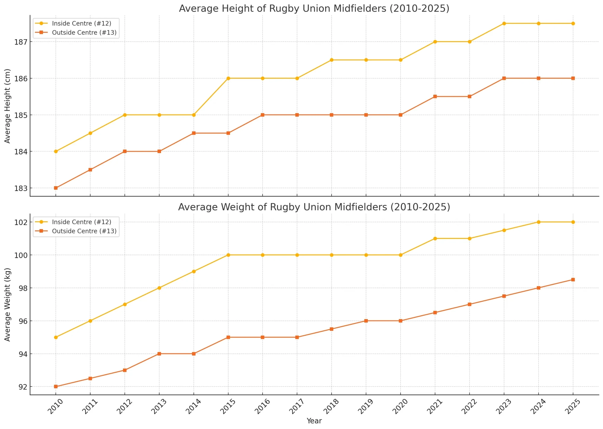 Steady Growth (2010–2015): Early in the decade, midfielders bulked up significantly. By 2015, an elite inside centre averaged ~185 cm/100+ kg, and an outside centre ~185 cm/95+ kg – roughly 5–6 kg heavier than in 2010 on average.