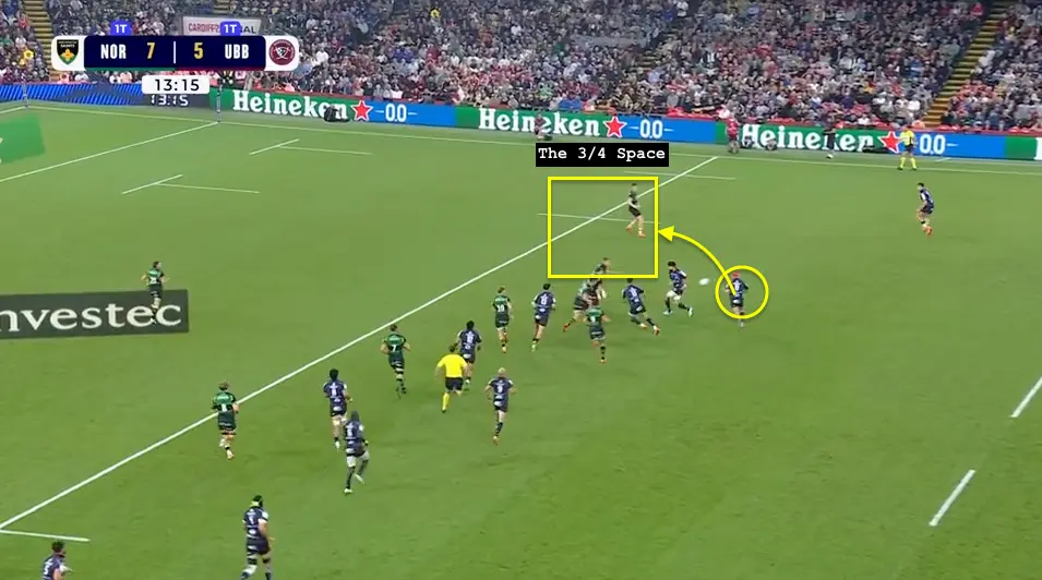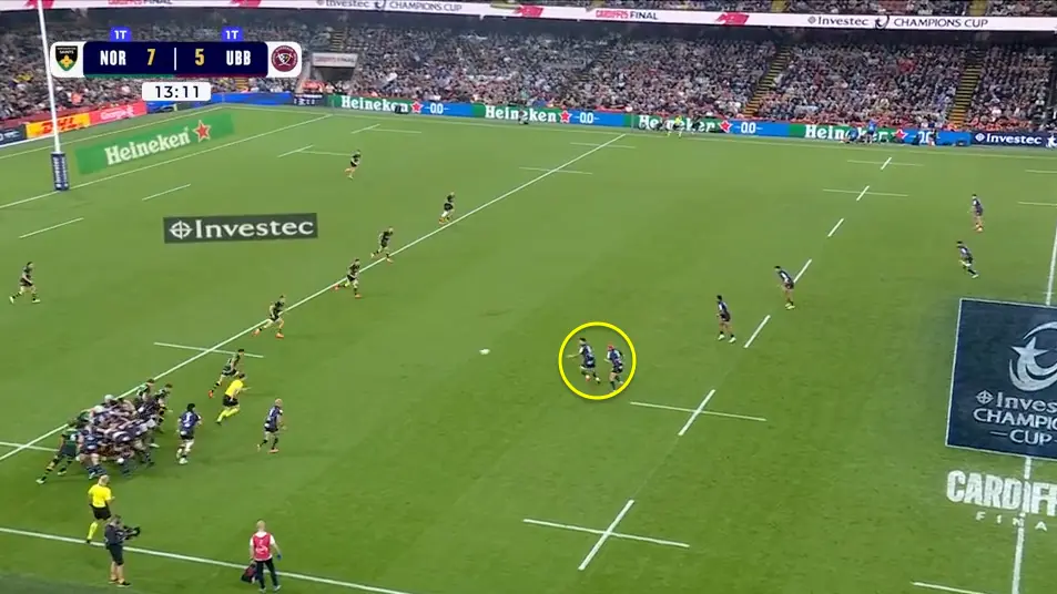 This is vital in how UBB and France use Bielle-Biarrey as a looped playmaker, especially in that 3/4 space. This is a great example from the Champions Cup final, which was ultimately struck off for a marginal forward pass.