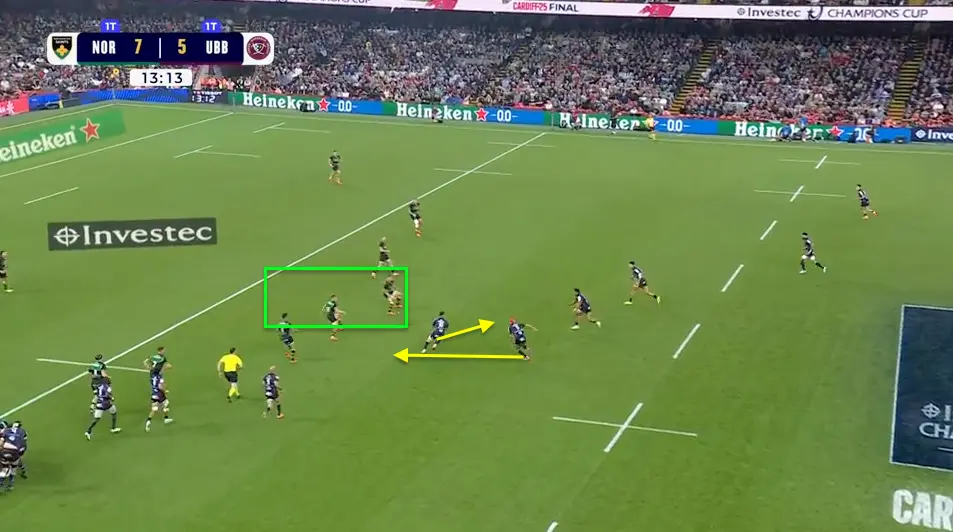 This is a really tight running line, but then something remarkable happens before they break. Bielle-Biarrey shows an inside line while Jalibert breaks outside, but this is a feint. It’s so effective that it stalls Northampton’s defensive progression.