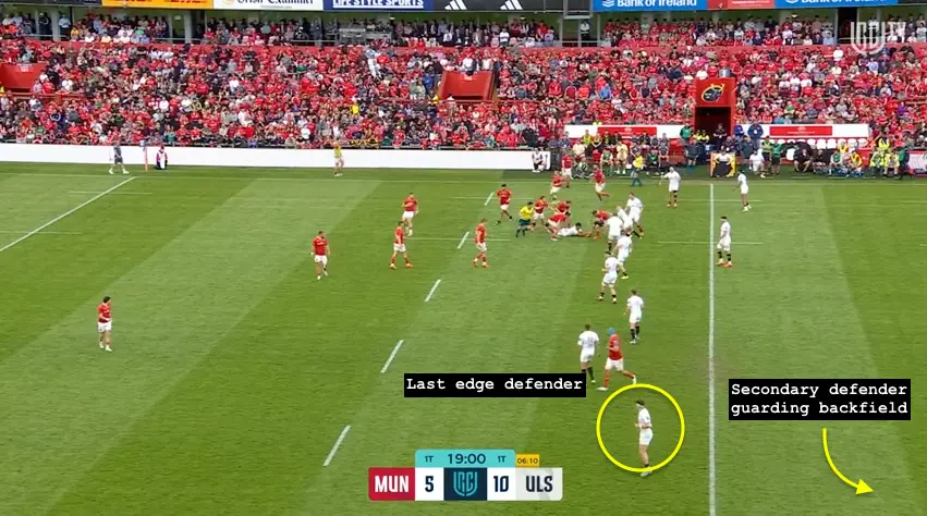 What that means, in practicality, is that on most defensive schemes at one side of the ruck – usually two passes away – there is a “hinge” in the opposition defence where one edge defender has to hold, two or three have to scramble fold and one secondary defender has to shoot up into the primary line, while another backfield defender closes the hole left by the defender that’s just shot up.
