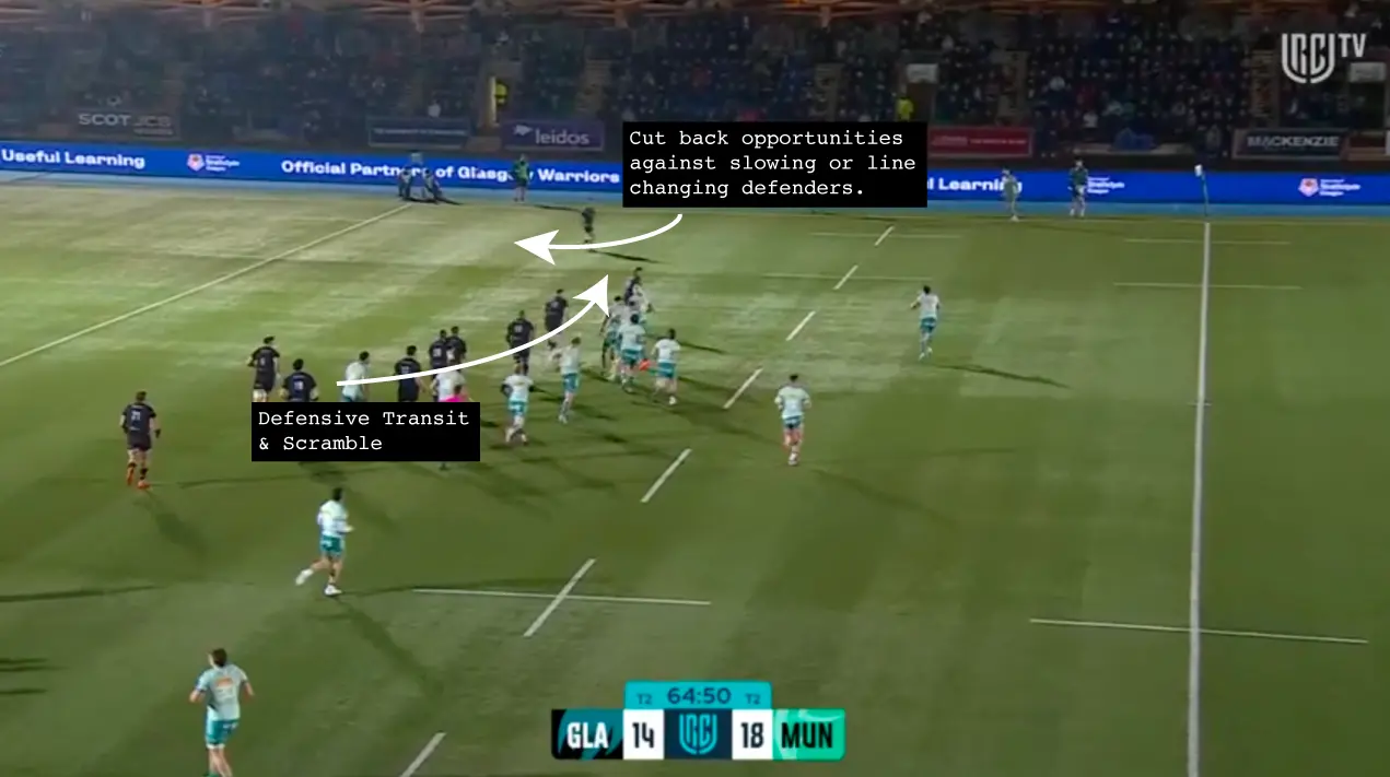 In that last example against Glasgow, you see the full concept working as planned – the ball moves from the first receivers hands to the second, and then onto Farrell. When he takes the ball he’s quite deep relative to the 3/4 space, but he is able to read and attack Glasgow’s scramble.