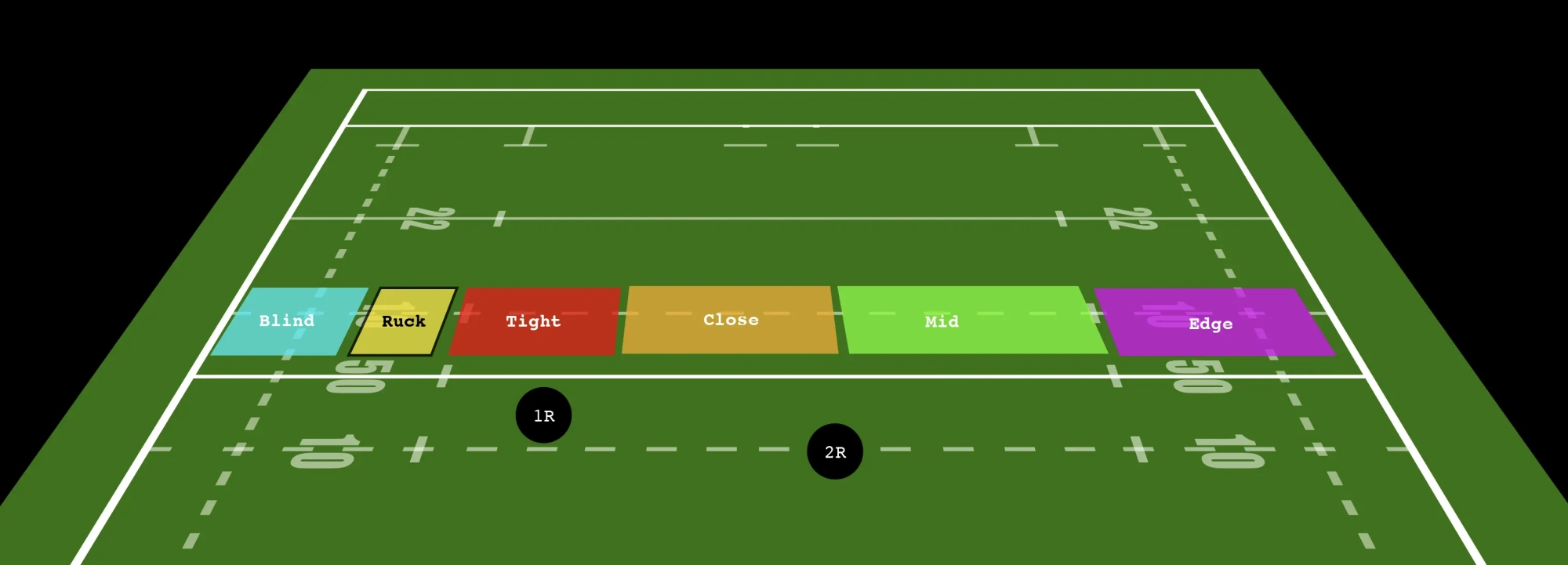 The black circles there represent First and Second Receivers. I haven’t included these as “flyhalf” or “#12” because they don’t strictly have to be any of those things, and in most systems, the players in those spots can be quite fluid based on their skillsets.