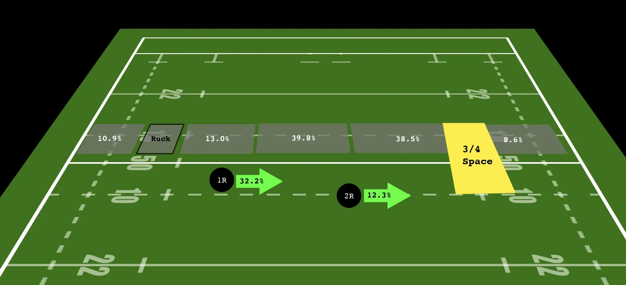 Let’s forget about forward shapes for a second because they just tell you where forwards tend to show up more often than not. It’s far more instructive to look at the zones of the field that Munster most often hit so far this season. To do that, we need to break up the field into radiating zones based on ruck position. All of these zones change and morph with the position of the ruck, but for clarity’s sake, I’m going to keep it at the left-to-right flow that we see here.