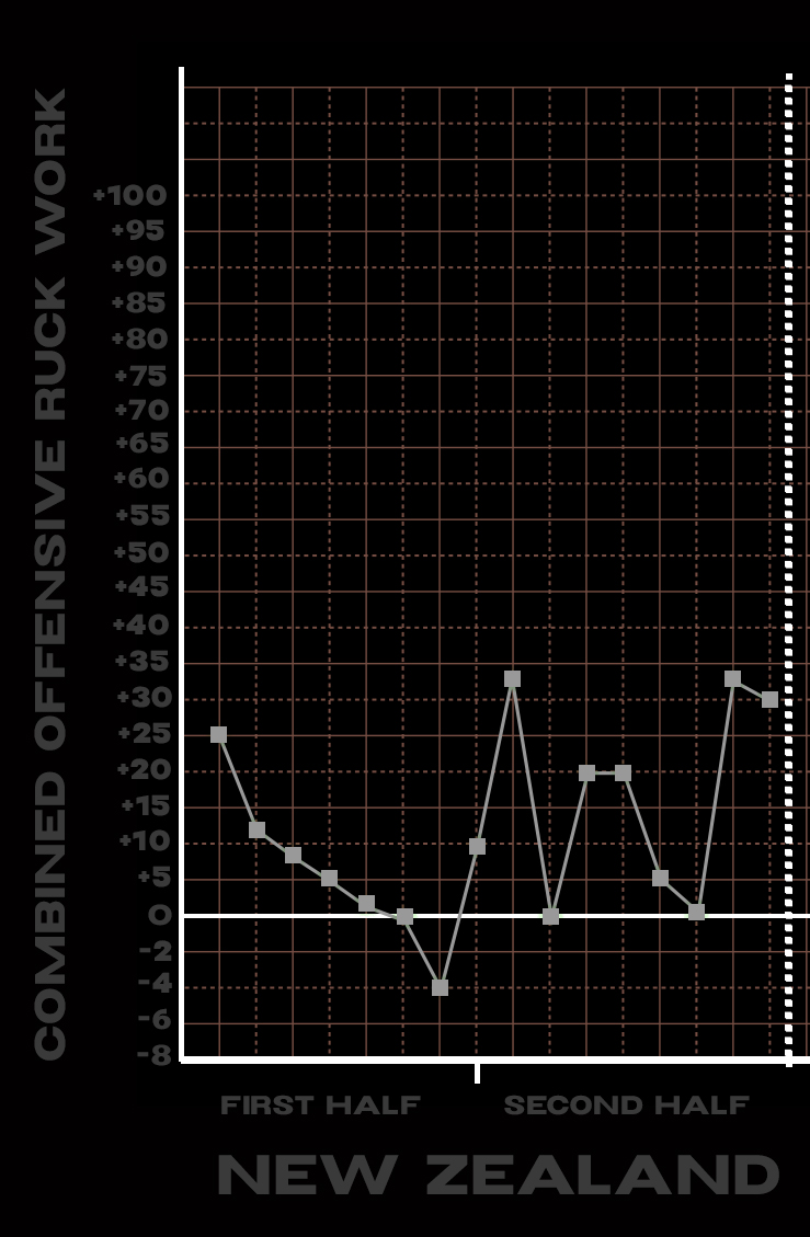 The lowest-rated CORW efficiency score was against Italy in the Six Nations – a game we won 36-0 – but that featured a really high PPC rate, an on-ball Kick to Pass ratio and 14 turnovers. It didn’t matter in that game because we always got the ball back, and quickly. That wasn’t the case against the All Blacks.