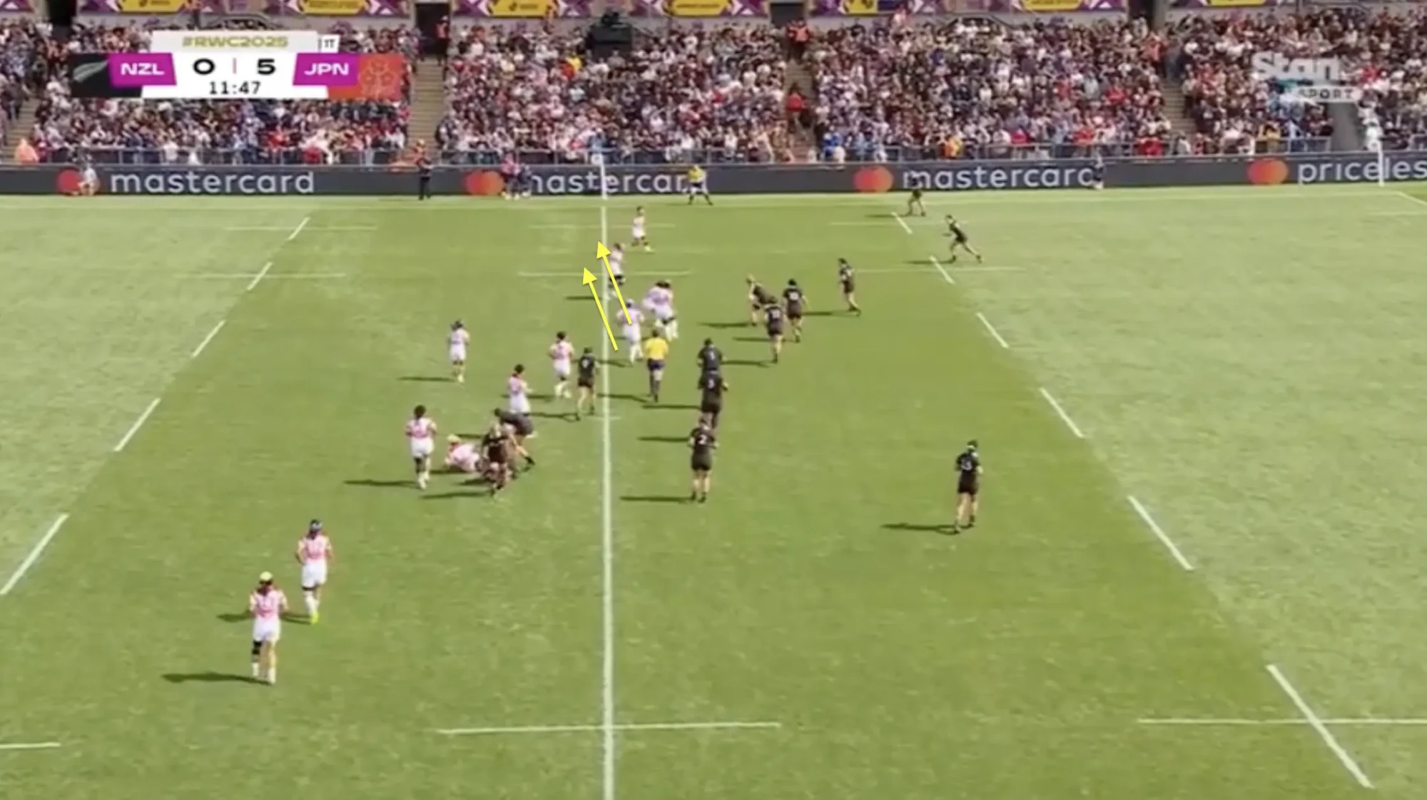 Japan were baited into this. Sure, there’s a bad pass at play there, but New Zealand are putting them into a position where any inaccuracy leads to this kind of turnover with lethal offloading and support lines off the first moment of transition.