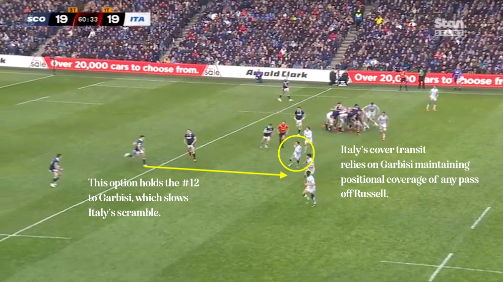 The key point is here. Italy compress on Garbisi in line with the Scottish midfield push, Russell swings behind it with Graham lurking to punish any rash reads by the Italian outside defence.